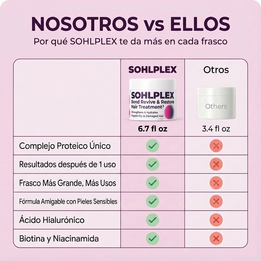 Hagamos los números: Un solo tratamiento de Olaplex No. 3 cuesta alrededor de $30 por 3.3oz (~$14/oz). Sohlplex 3 ofrece los mismos beneficios de reparación de enlaces por solo $4.13/oz — eso es un 70% de ahorro.